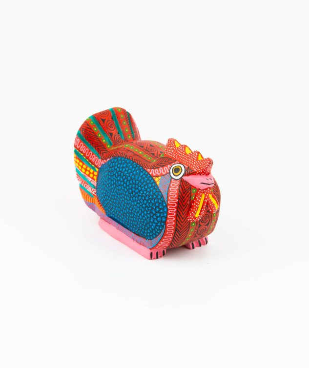 Alebrije de madera de copal. La decoración realizada con pintura acrílica. Se plasma un estilo de diseño de «Grecas Zapotecas» correspondientes a nuestra cultura prehispánica. La gallina representa La Abundancia.